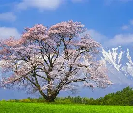 南阿蘇にある樹齢約400年の一本桜。満開の時期には多くの観光客が訪れる、熊本でも屈指の桜の名所です。背景に阿蘇の山々が広がり、写真映えする景色が広がります。
